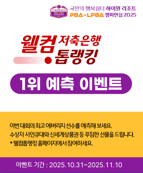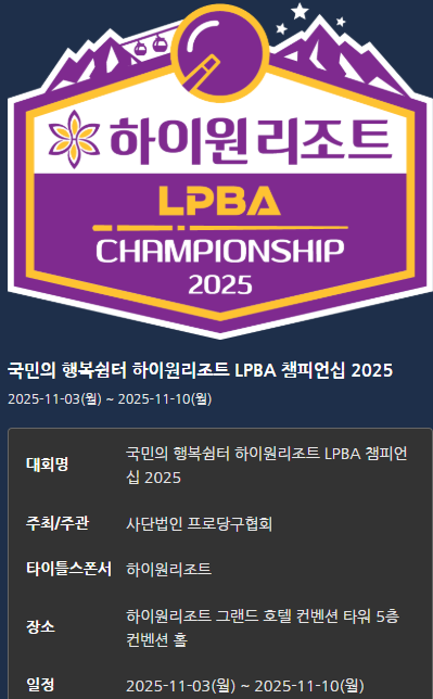 | 대회명 | 국민의 행복쉼터 하이원리조트 PBA-LPBA 챔피언십 2025 (Recreation area for Nationals High1 Resort PBA-LPBA Championship 2025) |